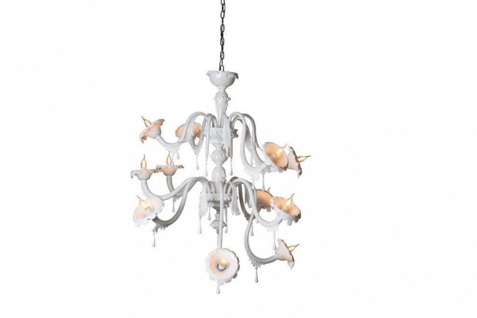 La collection Au Revoir comprend deux compositions en chandelier, respectivement avec 11 et 5 bras, et la lampe de table.