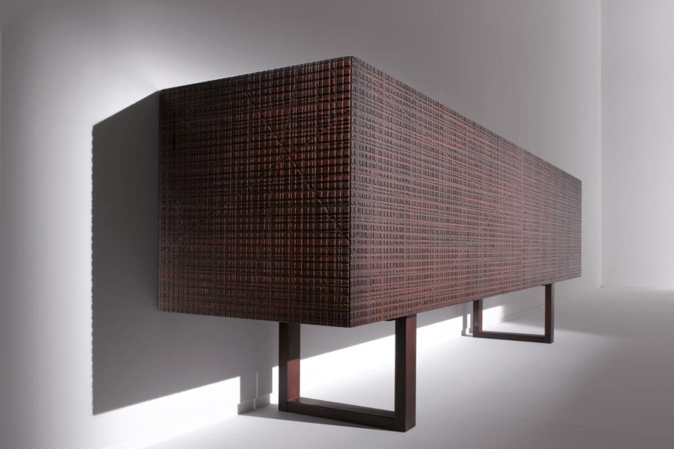 Le buffet BD 11 de Bartoli Design pour Laurameroni est un meuble de rangement, à la fois suspendu et sur pied, dont le design de surface est la caractéristique distinctive: la surface en bois de qualité est entièrement sculptée, créant un objet à la fois artistique et fonctionnel.