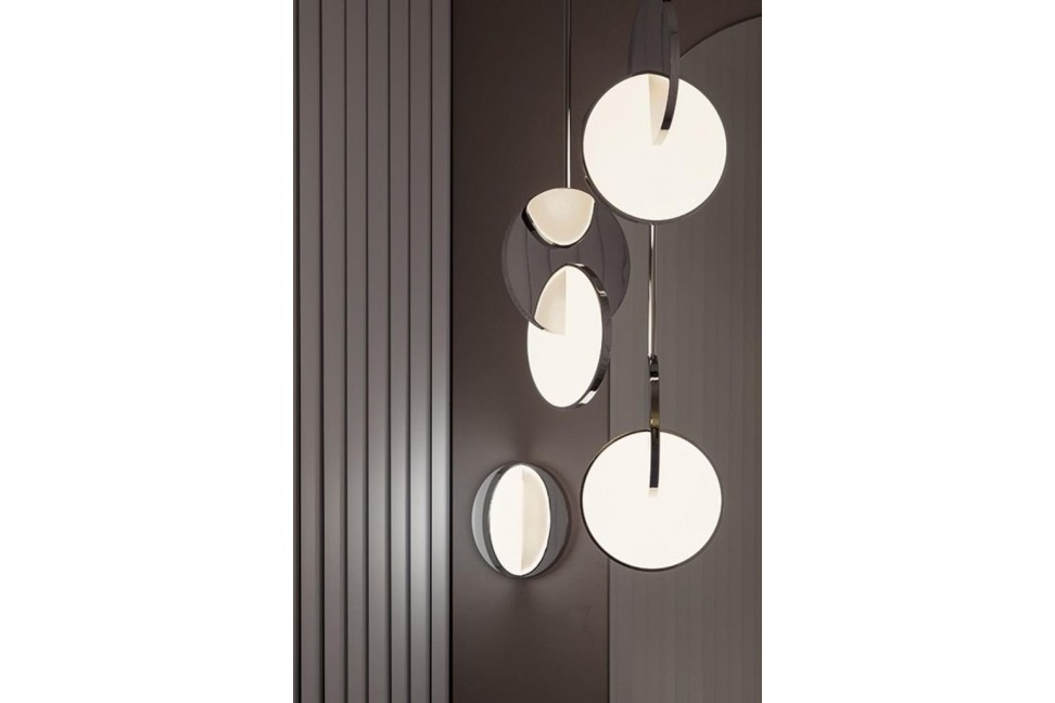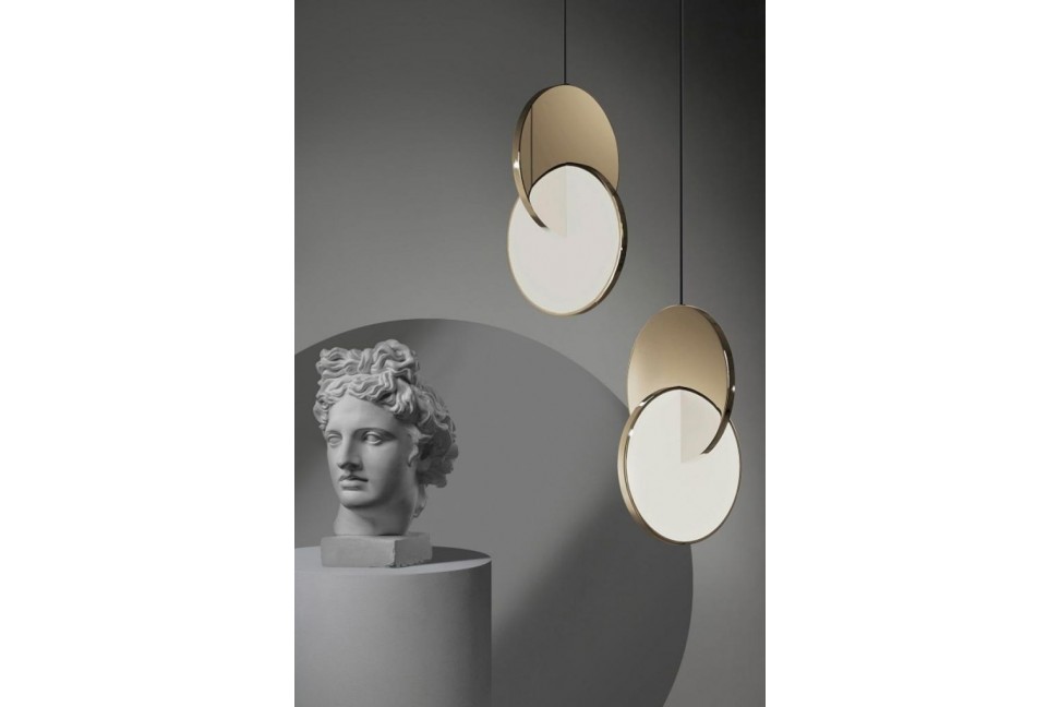 Eclipse est une collection de lampes suspendues et de table capables de créer de fascinants jeux de lumière rappelant l'effet d'une éclipse.Grâce à la combinaison étudiée de matériaux, tels que le métal miroir et chromé, et à l'angle à 90 degrés des disques suspendus, le célèbre designer britannique Lee Broom a réussi à donner vie à un objet extrêmement élégant mais qui ne passe pas inaperçu. La lumière réfléchie par le métal et produite par le LED illumine l'environnement et, en fonction du point d'observation, elle se révèle et s'éclipse. La lampe suspendue Eclipse est disponible en deux finitions, chrome ou or brillant, et peut être utilisée à la fois comme élément unique ou dans des compositions.