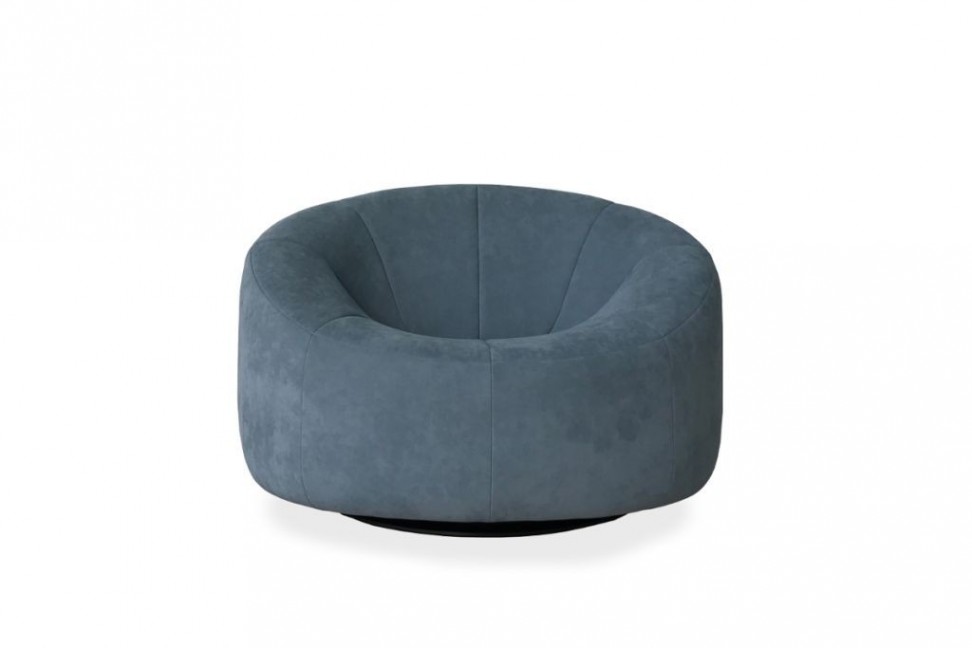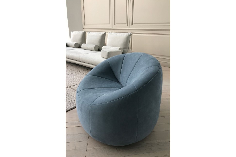 Le fauteuil Pumpkin, proposé en promotion dans notre showroom, est doté d'un revêtement en velours bleu ciel et d'un piètement pivotant en acier laqué noir.