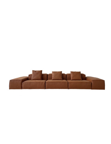 Le canapé Extrasoft en offre expo dans notre showroom est recouvert de cuir couleur rouille et est une composition linéaire composée de trois bases de 94 cm. Trois coussins de 50x50 cm sont également inclus, recouverts toujours en cuir couleur rouille.