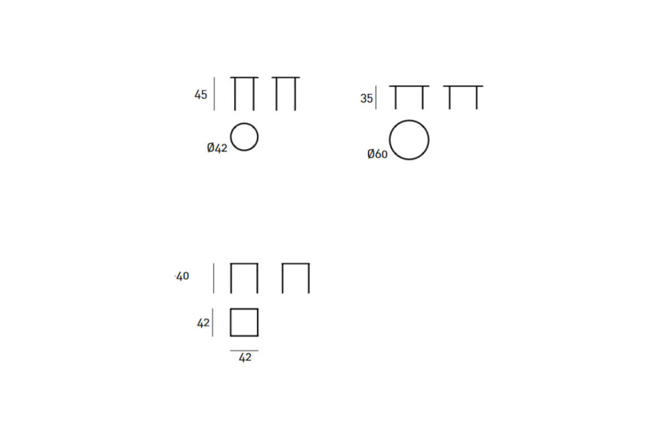Dimensions : n.1 cm ø42x45h, n.1 cm 42x42x40h, n.1 cm ø60x35h