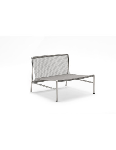 La chaise longue d'extérieur Hi Tech a une structure porteuse en acier inoxydable et un rembourrage pour le coussin d'assise en mousse polyuréthane à cellules ouvertes DRYFEEL S, recouverte de fibres pour l'extérieur et revêtue de tissu déperlant pour l'extérieur.