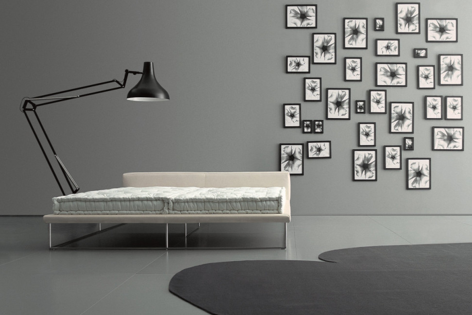 Le lit Ile Bed de Living Divani a de grosses formes rectangulaires qui donnent une impression d'ampleur de ses dimensions et qui se distinguent de la base très fine en tube d'acier.