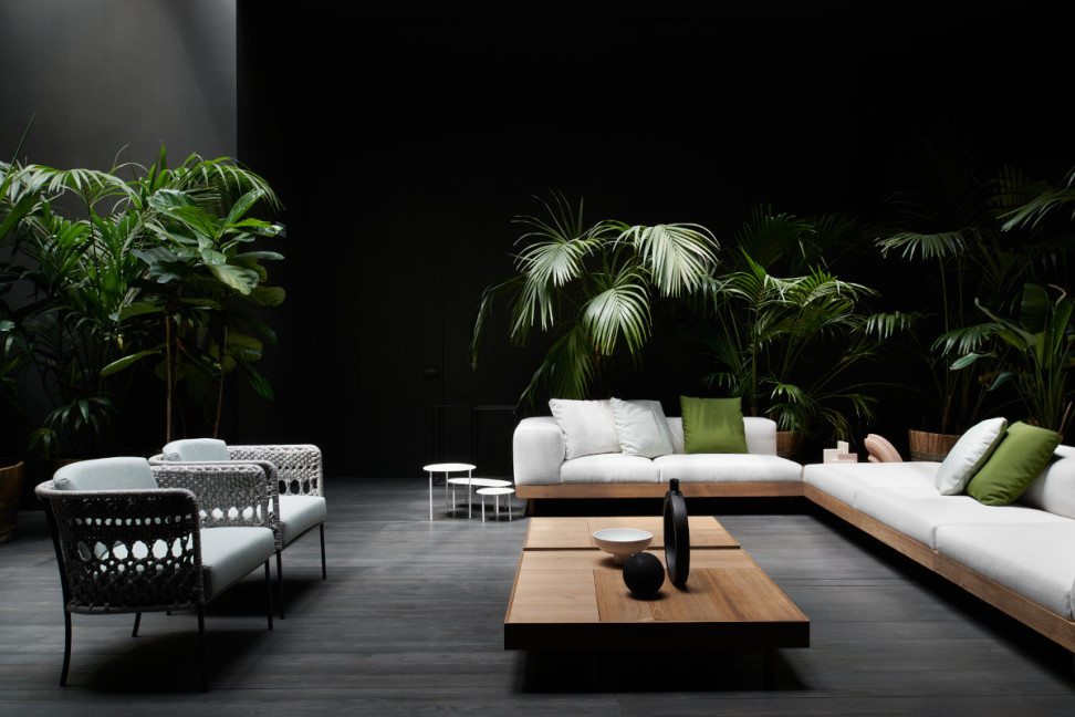 Living Divani offre la possibilité de personnaliser le siège en choisissant parmi différentes couleurs pour le dossier tressé et parmi différents revêtements pour les coussins.