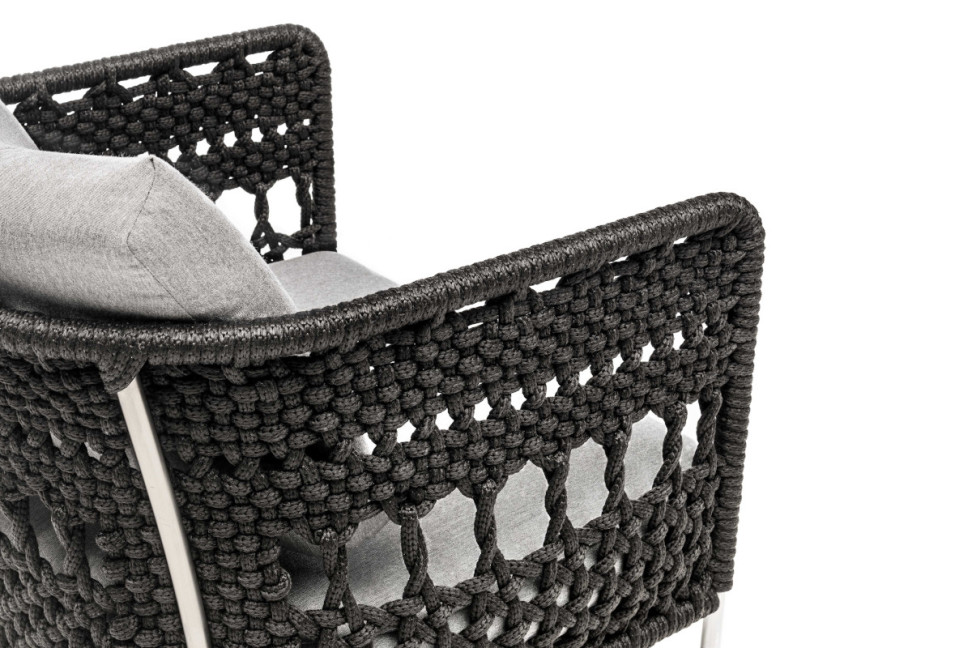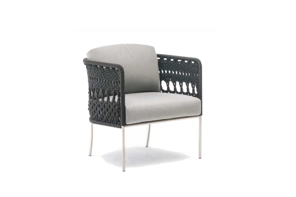 Pour le projet de la petit fauteuil Tombolo, Piero Lissoni s'appuie sur la collaboration du studio UN Pizzo, fondé par Bettina Colombo et Agnese Selva, qui réalise des objets de design en utilisant la complexe méthode du tressage à la main de la dentelle traditionnelle italienne. En partant justement du tressage de la dentelle de Cantù, Living Divani crée un siège original et vivant disponible aussi bien pour l'intérieur que pour l'extérieur. Suivant le dessin de la petit fauteuil Cafè, réalisée par Lissoni de nombreuses années auparavant, le siège Tombolo se caractérise par un dossier courbé, fait en tubulaire anallergique et recyclable tressé, enrichi d'un confortable coussin d'assise.