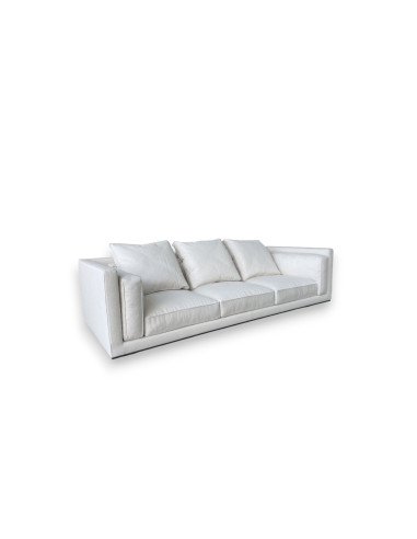 Le canapé Florius en offre expo dans notre showroom est la version dotée d'un revêtement en tissu blanc et d'une structure en aluminium peint nickel bronzé. Il comprend également un ensemble de 3 coussins de dossier recouverts du même tissu que le canapé.
