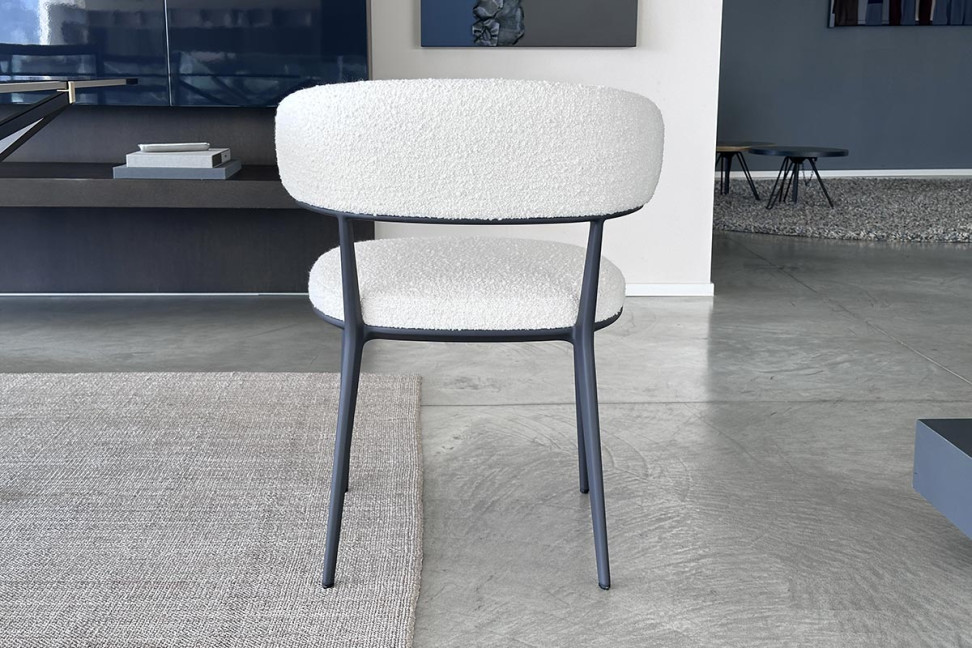 La chaise haute Caratos en offre expo dans notre showroom a une structure en aluminium coulé peint en couleur graphite, tandis que l'assise et le dossier sont revêtus d'un tissu bouclé raffiné de couleur blanche qui, en contraste avec la structure, met en valeur les formes et la raffinerie.