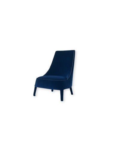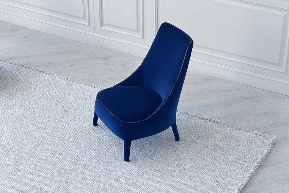 Le Fauteuil Bèrgere Febo sans accoudoirs, en offre expo dans notre showroom, est revêtu d'un tissu en velours doux de couleur bleu intense, qui met en avant son élégance. Dans cette version, les pieds sont également entièrement recouverts de tissu, tandis que les lignes sinueuses du dossier et de l'assise sont mises en évidence par une couture contrastante avec un point de cheval en fil de couleur gris perle.