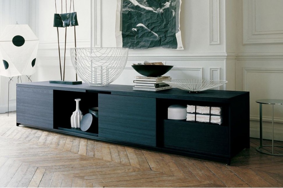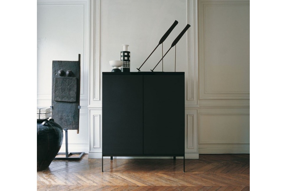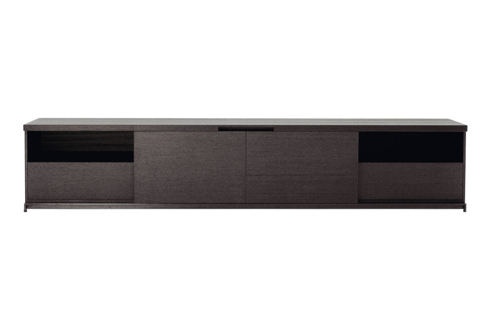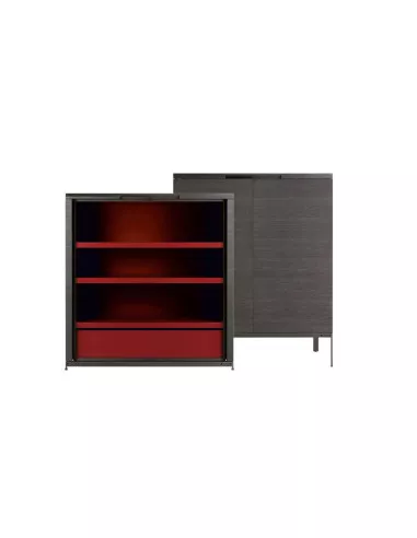 Le conteneur Mida de Maxalto a une base en profilés d'acier bronzé, chromé brillant, peint en nickel ou peint en noir, sur laquelle reposent différents types de conteneurs : conteneur simple, crédence basse et bibliothèque. Différentes finitions sont disponibles.