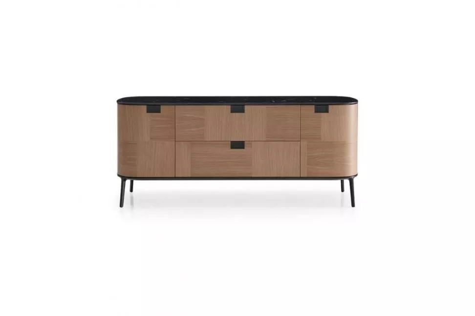 Disponible en trois modèles différents de hauteurs variées, le conteneur Tesaurus présente une base en métal avec une structure en bois plaqué et des portes battantes revêtues en bois ou en parchemin, tandis que le plateau supérieur est en marbre. L'intérieur est équipé d'étagères et de compartiments qui répondent à tous les types de besoins pratiques.