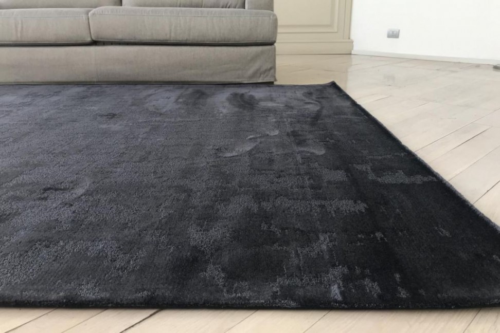 Tapis rectangulaire en 100 % soie botanique couleur gris foncé.