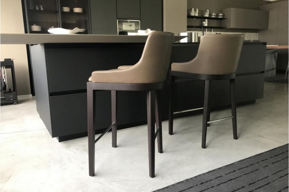 Le tabouret Liberty, en promotion dans notre showroom, est caractérisé par un élégant revêtement en cuir couleur taupe souligné par une base en frêne teinté marron foncé, dont la combinaison crée un contraste chromatique d'un grand impact.