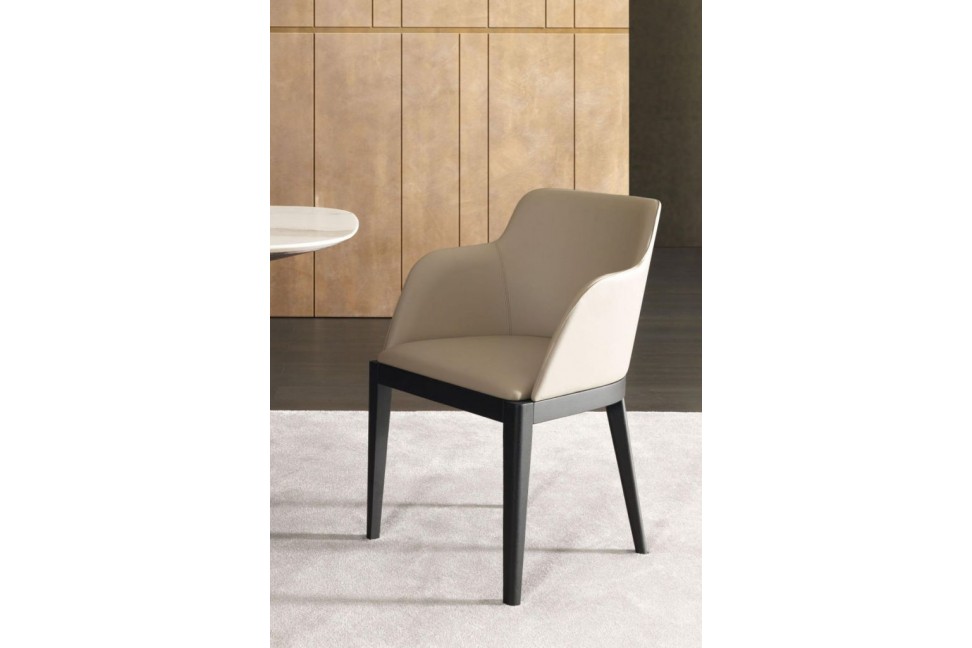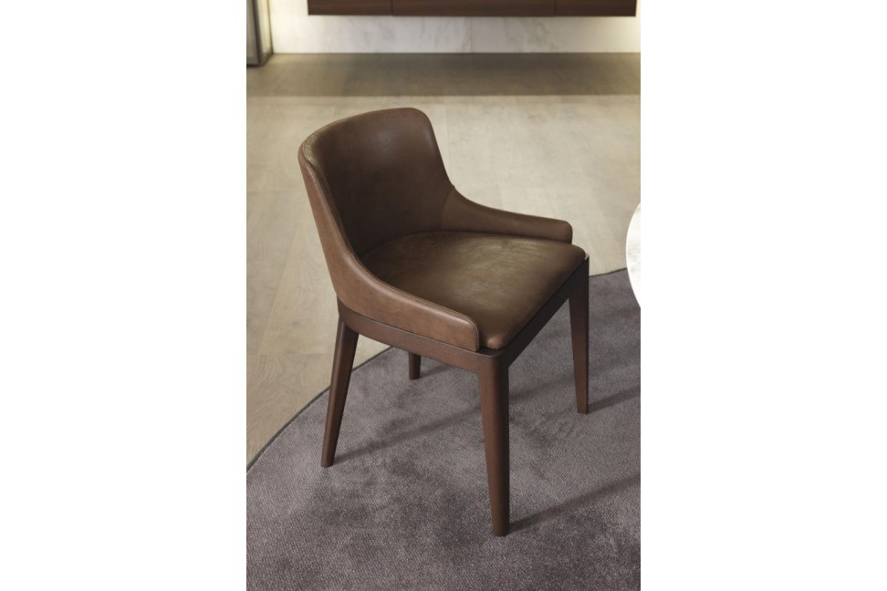 Cleò est disponible en trois modèles, avec un dossier haut sans accoudoirs, et bas avec ou sans accoudoirs, et présente une base en bois massif de chêne surmontée d'un siège et d'un dossier rembourrés recouverts de tissu ou de cuir.