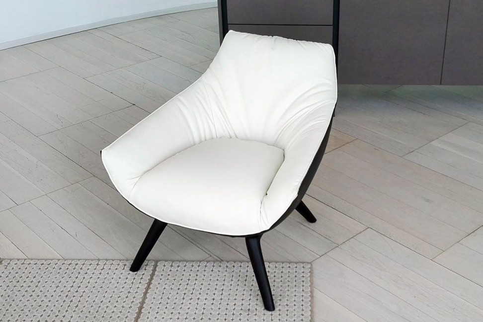 Le fauteuil Florentia, en offre expo dans notre showroom, est un complément élégant et raffiné qui saura s'insérer parfaitement dans votre salon, l'enrichissant d'une touche originale grâce à son revêtement bicolore en cuir blanc et noir, mis en valeur par les pieds en chêne teinté noir.