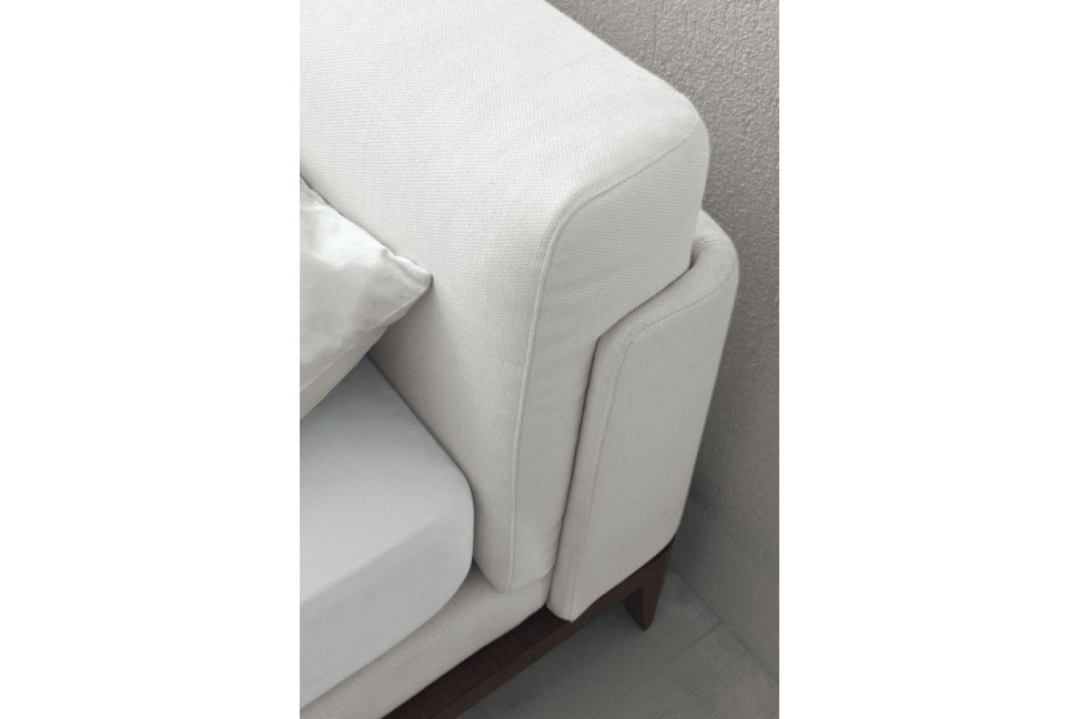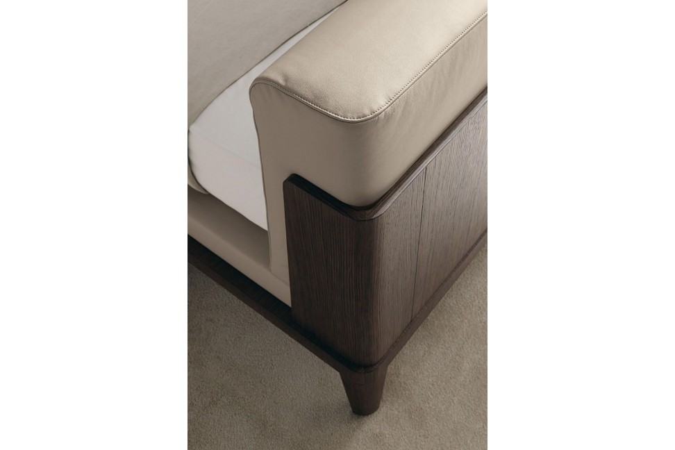 Comme le modèle dont il s'inspire, Assuan présente une structure extérieure en bois qui enveloppe l'élégant contour de lit et la imposante tête de lit, tous deux largement rembourrés et recouverts de tissu ou de cuir. Les courbes harmonieuses des coussins et la forme allongée des pieds contribuent à adoucir le poids visuel du bois massif, rendant les proportions plus équilibrées et harmonieuses.