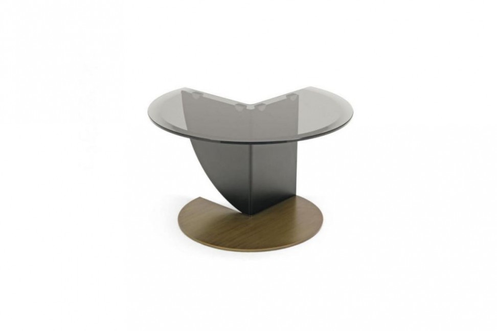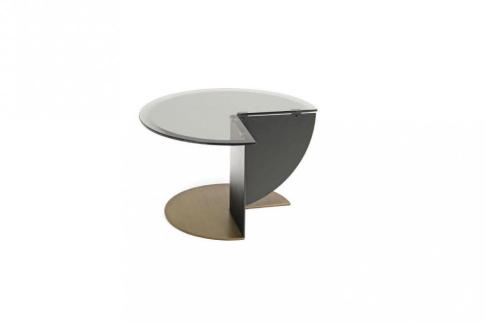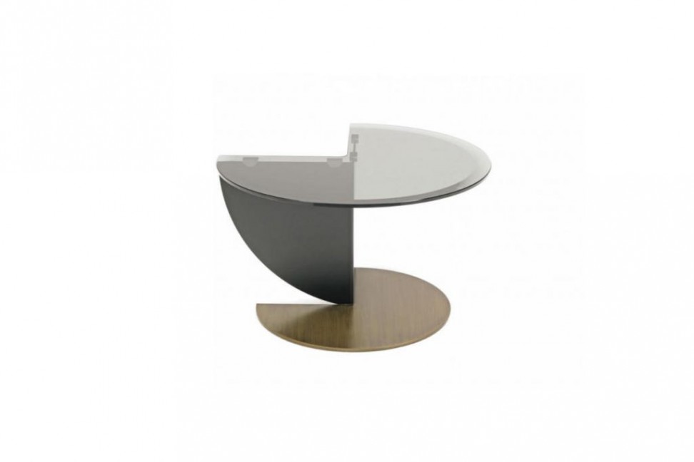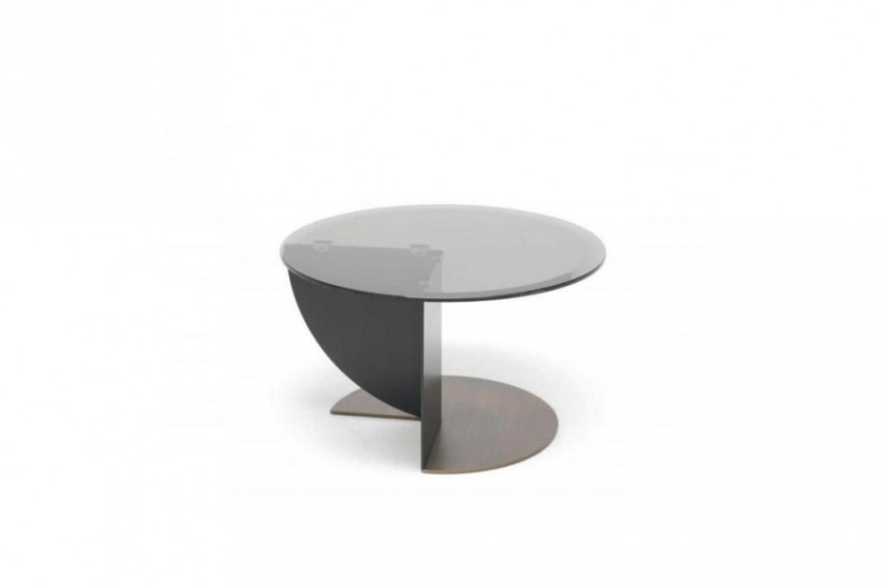La particularité de cet objet de design est sa fonctionnalité. Deux plateaux arrondis en verre fumé reliés par une base géométrique permettent de profiter du table basse à la fois individuellement et comme élément de service en association avec des canapés, poufs et lits.