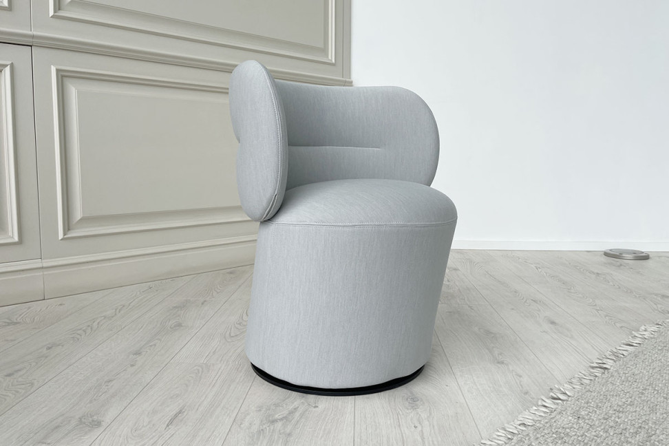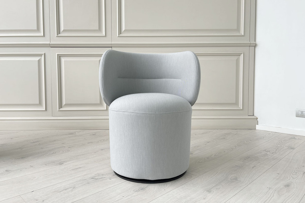 Les fauteuils Getlucky en offre expo dans notre showroom se caractérisent par un revêtement en tissu de couleur grise ou turquoise. La base pivotante est en acier peint en noir.