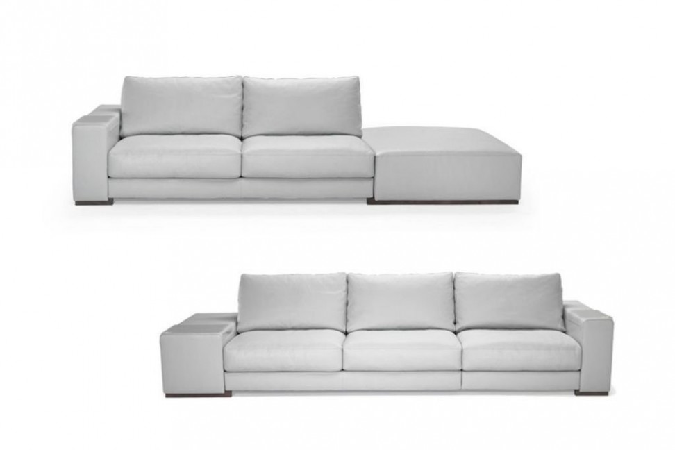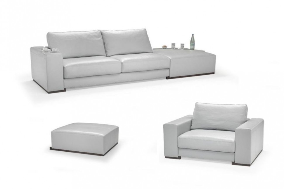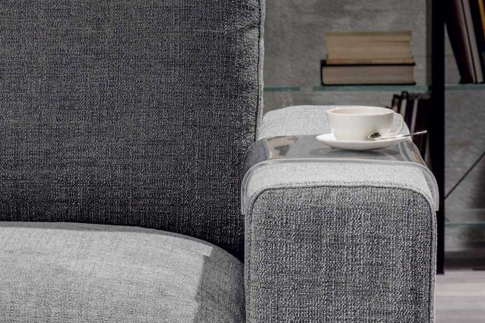 Le canapé Domino présente un revêtement en tissu ou en cuir enrichi de pratiques bandes en matériau plastique transparent placées sur les accoudoirs, qui permettent de poser des objets, des verres et des aliments sans altérer le revêtement.