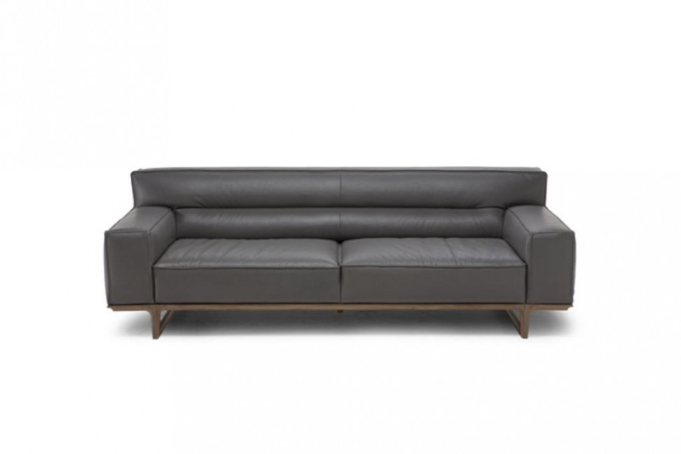 Disponible en tissu ou en cuir, le canapé Kendo se caractérise par des coutures particulières le long des bords et sur le dossier, ainsi qu'une base en bois embellie par des inserts en métal.