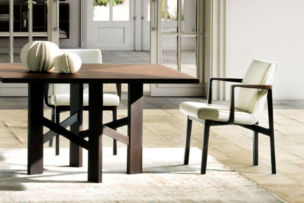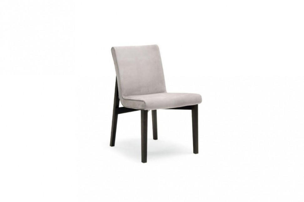 Disponible à la fois en version avec accoudoirs et sans, la chaise Sonata présente une structure en bois qui soutient et encadre l'assise et le dossier, rembourrés et recouverts dans les tissus et les cuirs de la collection.