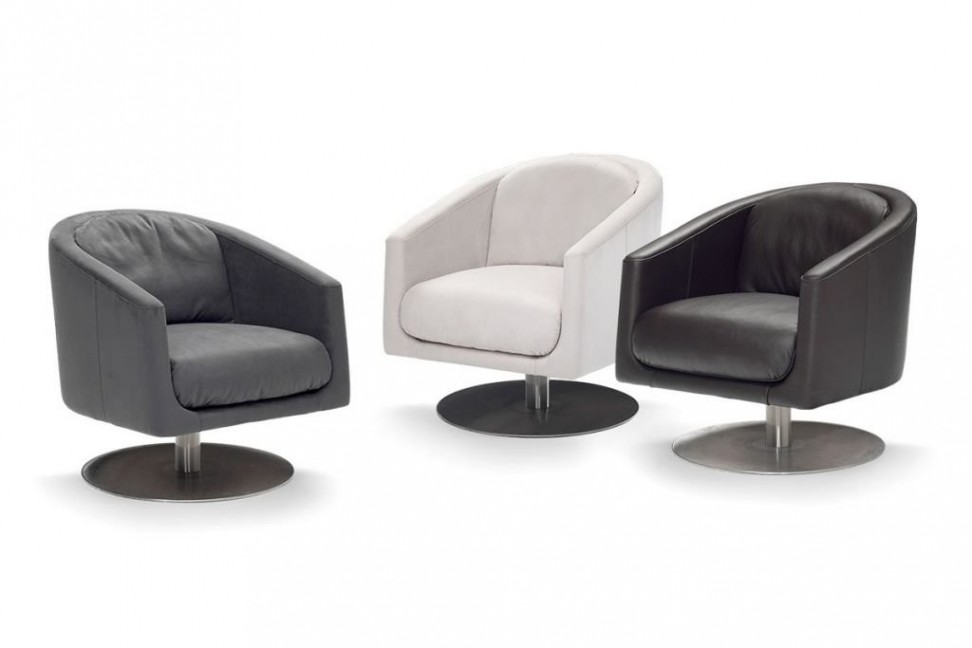 Le fauteuil Liu, disponible avec un revêtement en tissu ou en cuir, présente une base pivotante particulière en métal qui soulève le siège, le faisant presque flotter dans les airs.