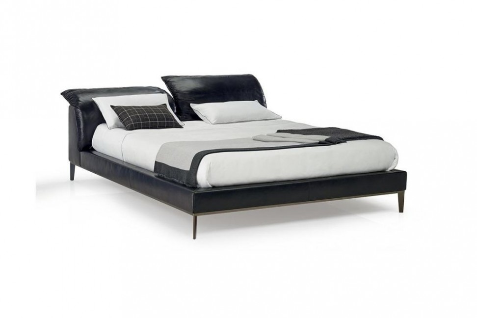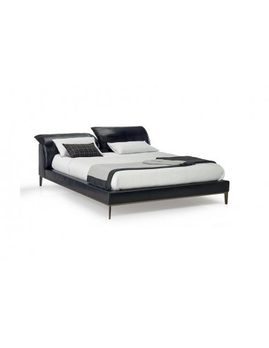 Vela est disponible en différentes tailles et se compose d'une fine base en métal qui définit et souligne le périmètre, ainsi que d'une tête de lit et d'un tour de lit rembourrés recouverts de tissu ou de cuir.