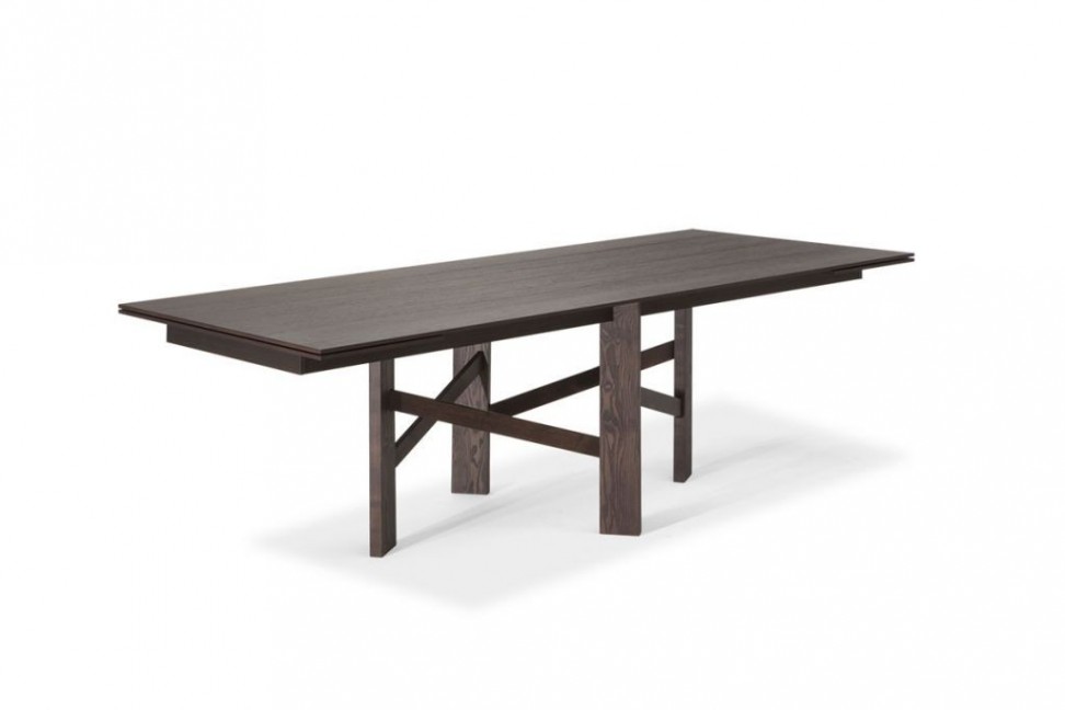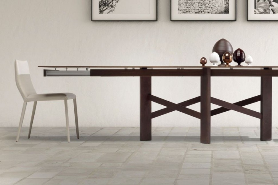 La table Accademia est entièrement réalisée en bois de frêne dans diverses finitions et est disponible avec un plateau fixe de forme ronde ou carrée, ou extensible de forme rectangulaire.