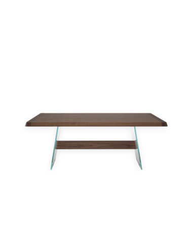 Caractéristiques Techniques: La table à manger Phantom présente une base en verre trempé extra-clair, composée de deux plaques de forte épaisseur reliées par une traverse centrale en bois massif, disponible en différentes finitions. Le système de fixation comprend des plaques en acier inoxydable et un collage UV pour garantir la stabilité et la sécurité, tandis que des inserts antidérapants en caoutchouc assurent un bon appui des plaques de verre.