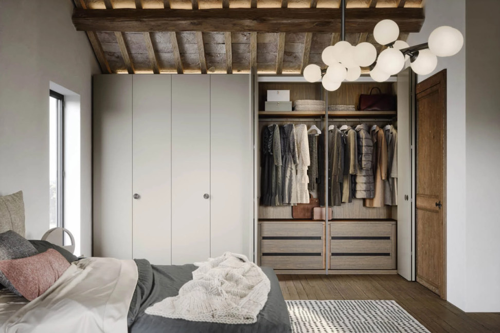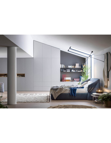 Caractéristiques Techniques : Le modèle Alfa est disponible en différentes finitions, vous permettant de personnaliser l'armoire selon vos besoins. Vous pouvez choisir parmi une large gamme de couleurs et de matériaux, des tons les plus neutres comme le blanc et le gris, jusqu'aux variantes plus chaudes comme le bois naturel. Réalisable également en version courbe ou pour combles, le modèle Alfa offre la possibilité de sélectionner également le type de porte pliante.