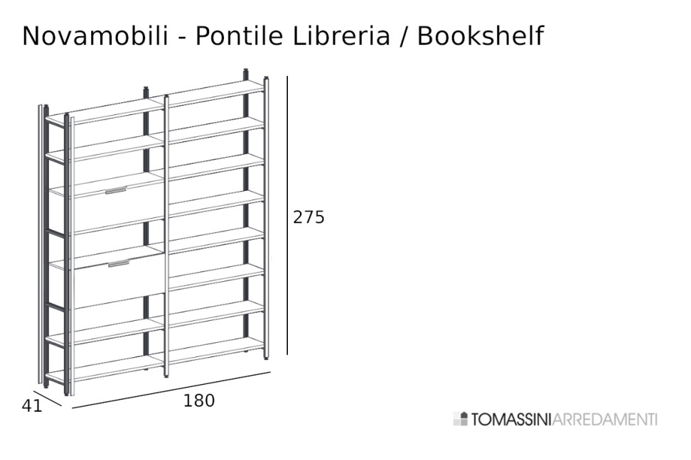 Le prix indiqué se réfère à la libreria Pontile cm.180x41x275h avec des montants en finition brunie, 12 étagères et deux contenants avec porte à abattant en finition laquée mate.