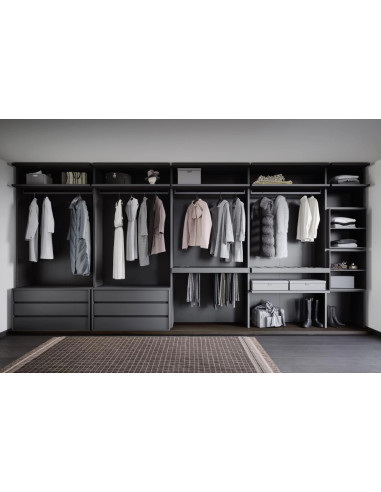 Le prix indiqué se réfère à la cabine de dressing Ben cm.273x49.3x258h avec une structure en mélaminé, 3 étagères, 5 barres de penderie et une commode à trois tiroirs.