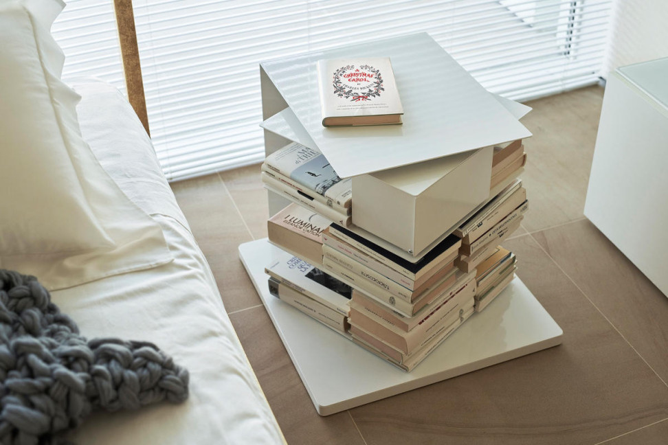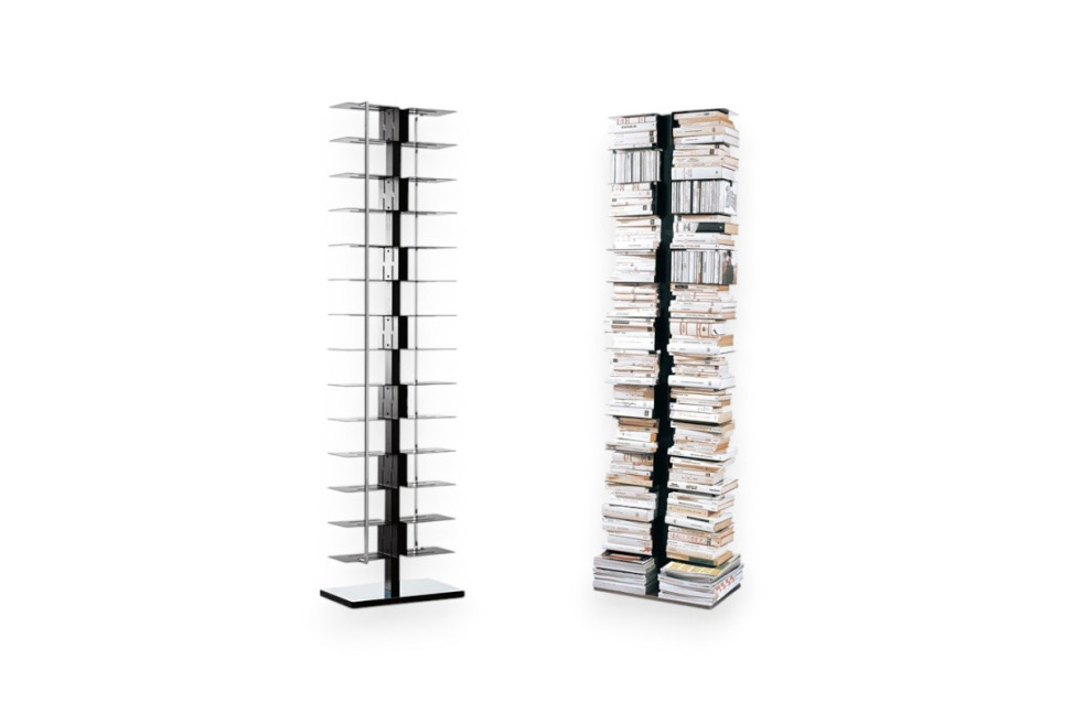 La bibliothèque Ptolomeo d'Opinion Ciatti, conçue par le designer Bruno Rainaldi, est une icône du design contemporain récompensée par le Compasso d'Oro en 2004, célèbre pour sa structure verticale qui disparaît pour laisser les livres occuper le devant de la scène.