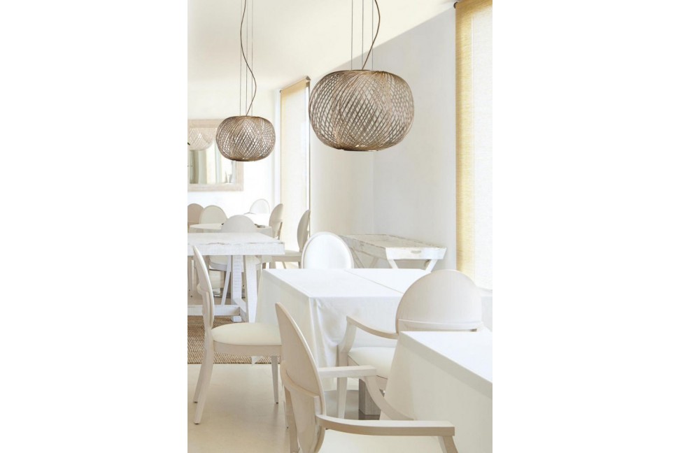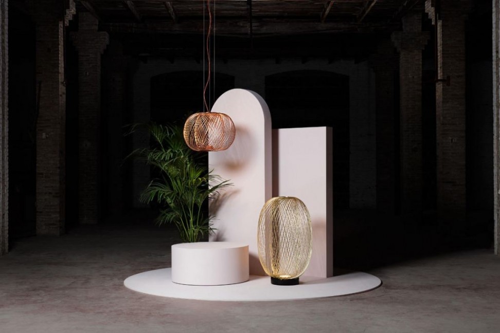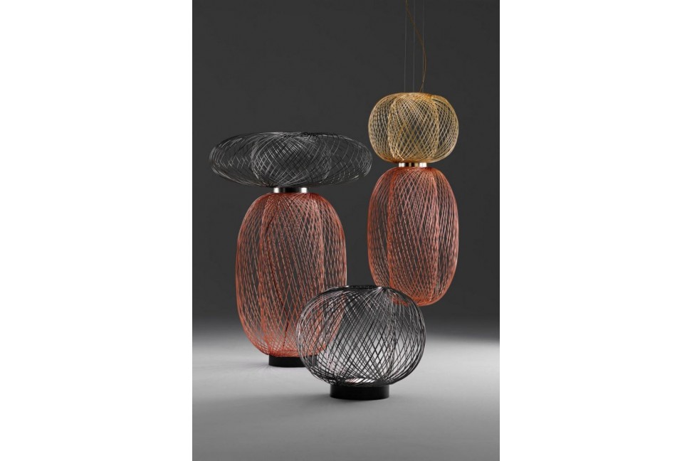 Le designer américain Stephen Burks est l'esprit créatif qui a conçu la structure originale de la lampe, constituée d'un réseau en acier électroplaqué disponible en noir, or ou cuivre, fixée au plafond par un câble de 5 m de long et un rosace réalisé dans les mêmes finitions que la structure. La silhouette légère et harmonieuse d'Anwar est mise en valeur par les deux lumières LED positionnées à la base de la structure, orientées l'une vers le haut et l'autre vers le bas, créant un effet unique et fascinant dans l'environnement. La collection Anwar comprend des lampes suspendues de différentes formes et tailles, simples ou composées, ainsi que la lampe de sol.