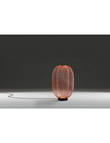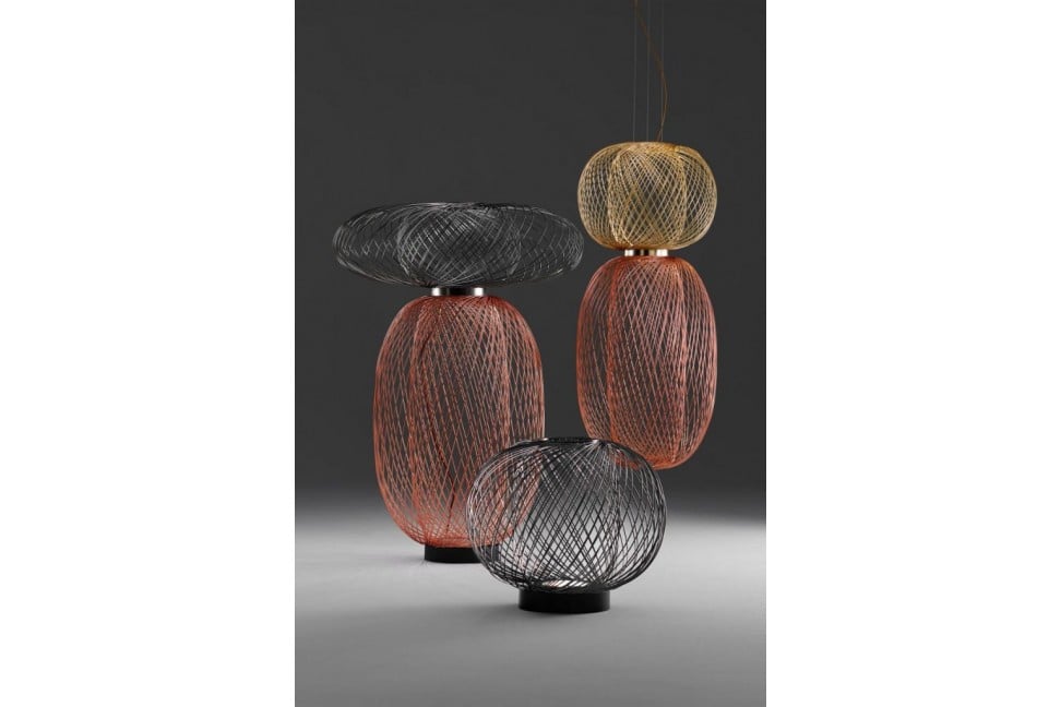 La collection Anwar est l'une des lignes les plus attrayantes réalisées par la marque espagnole d'éclairages de design Parachilna.Née d'une idée du designer primé Stephen Burks, Anwar se compose de lampes au style innovant et aux formes affirmées, capables de fasciner et d'attirer l'attention. La version sur pied présente une structure arrondie constituée d'un réseau de cordes en acier électroplaqué disponible en noir, or et cuivre. Ses généreuses dimensions sont équilibrées par la légèreté de sa structure tissée, qui permet de la placer à n'importe quel endroit de la pièce sans obstruer visuellement le mobilier environnant. La source lumineuse est positionnée à la base et pointe vers le haut, traversant les rayons en acier et projetant dans l'environnement de délicates ombres géométriques.