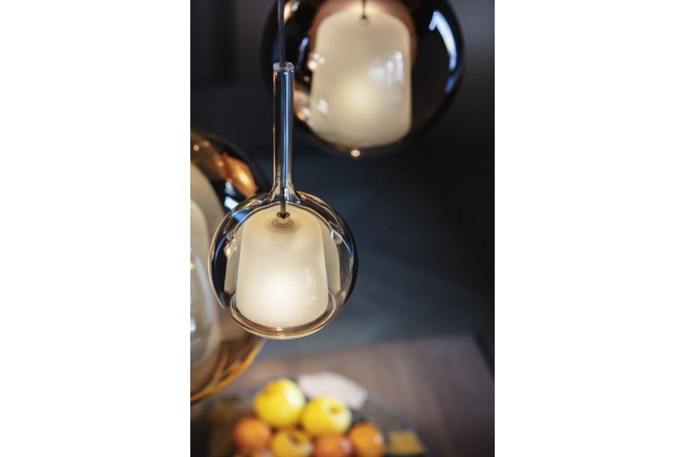 Cette lampe moderne et polyvalente, imaginée par le célèbre designer italien Carlo Colombo, est composée d'une structure en métal chromé brillant et d'une sphère en verre borosilicate, composée d'un diffuseur extérieur transparent ou coloré et d'un intérieur couleur sable. La possibilité d'associer une large gamme de couleurs aux trois différentes tailles de la lampe offre l'opportunité de créer des compositions attrayantes et de donner ainsi vie à des jeux de reflets fascinants entre la surface en verre et l'espace environnant. La collection Glo comprend également la lampe de table, de sol et murale.