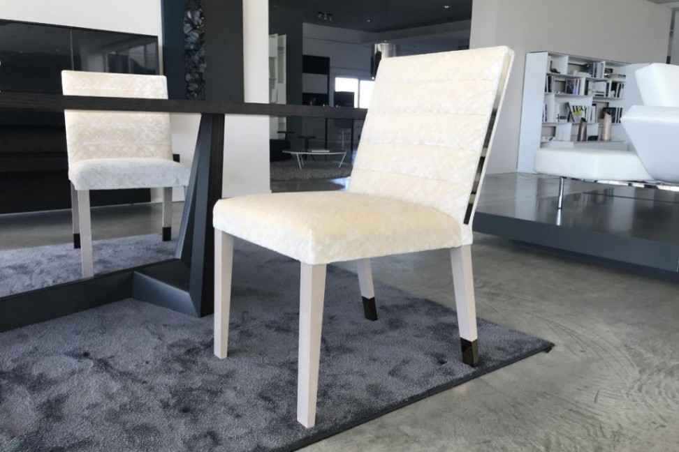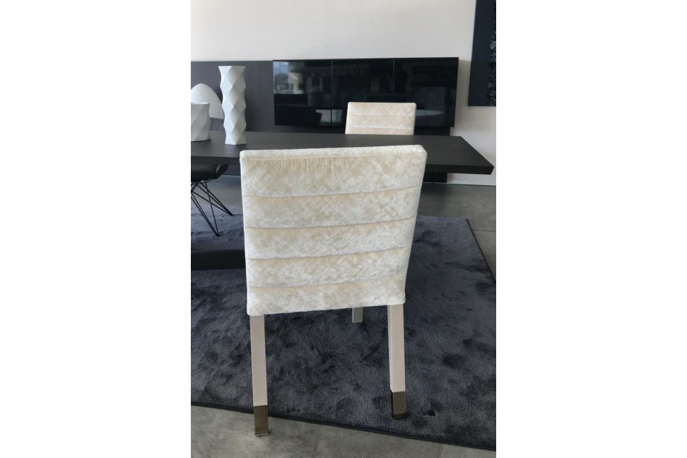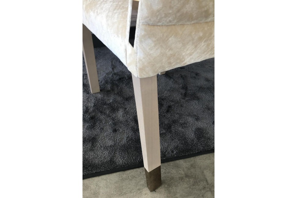 La chaise Aston, en offre expo dans notre showroom, se caractérise par un revêtement en velours blanc avec une délicate texture à la surface, qui contraste avec le bois des pieds et le métal des embouts arrière et de l'insertion du dossier, restituant un effet recherché et innovant.
