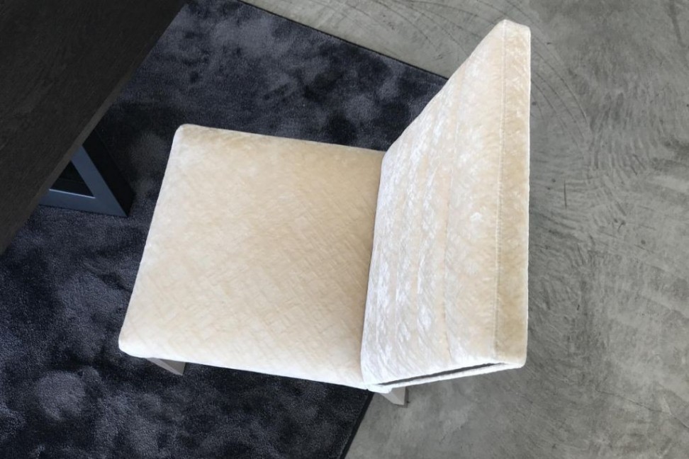 Chaise avec base en bois, embouts arrière et insertion en métal, revêtement en velours texturé couleur blanc ivoire.