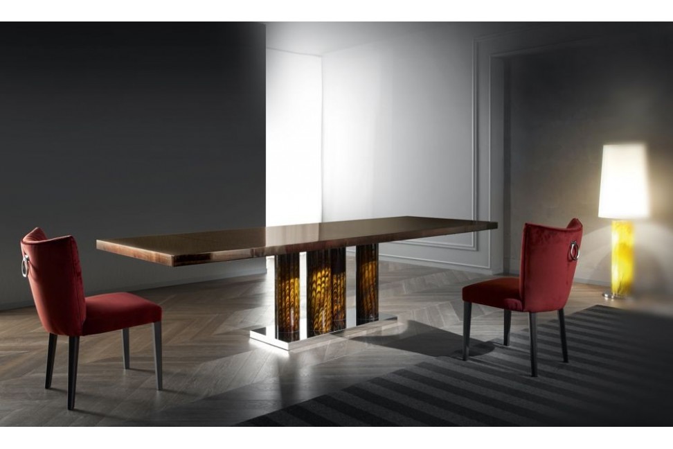 Fenice est une table extensible réalisée par Pietro Costantini avec un design moderne. Elle est disponible en diverses finitions et aussi dans la version fixe. La table se distingue par sa base raffinée en acier inoxydable et en verre de Murano. L'utilisation combinée de matériaux différents confère à la table style et unicité. Grâce à son aspect formel et élégant, Fenice est particulièrement adaptée aux environnements traditionnels et austères. La table se présente comme un élément de mobilier distinct qui parvient facilement à attirer l'attention.