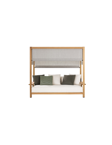 Le baldacchino Ketch se caractérise par un large siège auquel on peut ajouter des coussins pour augmenter le confort. Le revêtement est réalisé dans un tissu parfait pour résister aux intempéries et entièrement déhoussable tandis que les tentes sont en fibre de polyester. La structure est disponible en iroko naturel ou teinté noir et le dossier en EVA teinté couleurs.