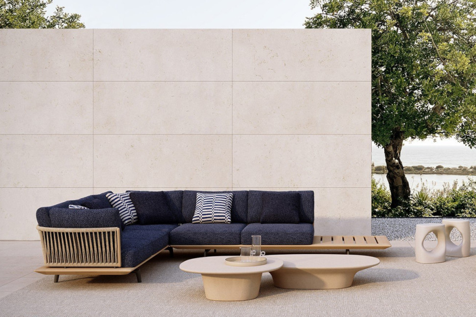 Le canapé outdoor Lagoon peut être personnalisé en choisissant parmi différentes nuances de corde tressée et de nombreux revêtements en tissu. De plus, il est possible d'ajouter à la composition du canapé des poufs et des tables basses en bois ou en grès avec verre coulé, disponibles en différentes couleurs.