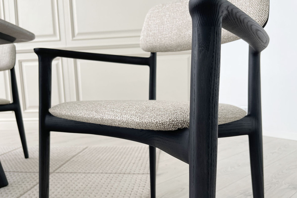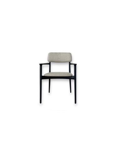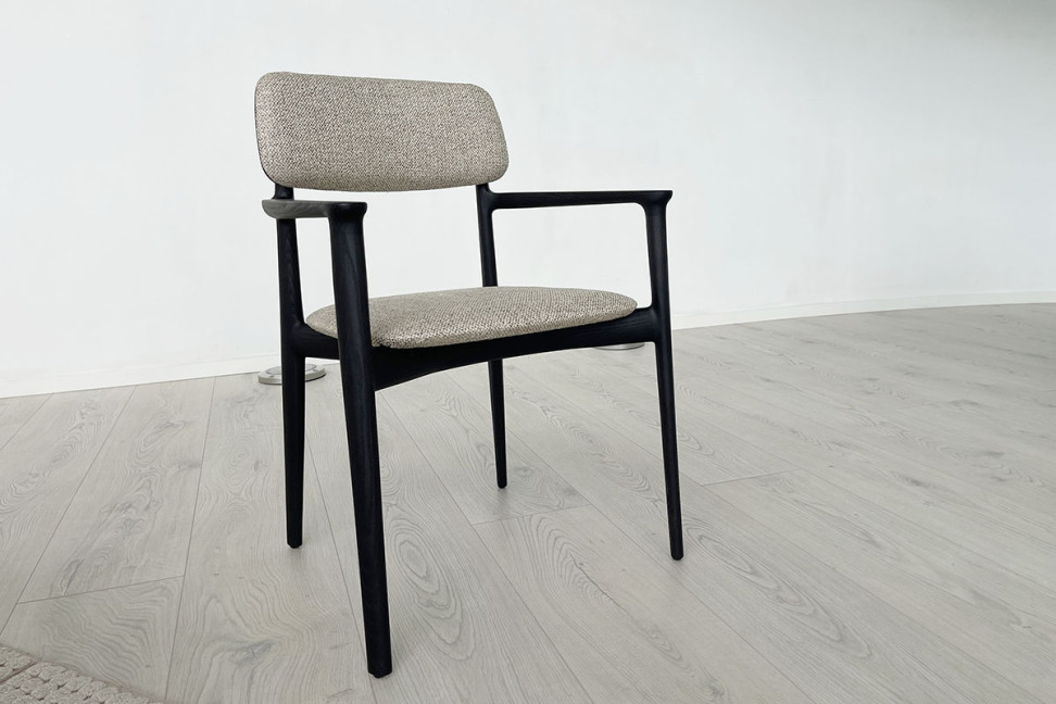 La chaise Curve en offre expo dans notre showroom est la version avec accoudoirs. La structure est en orme noir, l'assise et le dossier sont recouverts d'un tissu couleur corde.