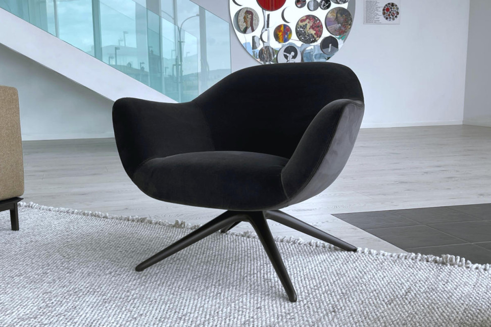 Le fauteuil Mad Chair de Poliform, créé par Marcel Wanders, se distingue parmi les fauteuils Poliform par son dossier bas et ses lignes enveloppantes, conférant à cet élégant complément de mobilier un aspect accueillant et invitant. La marque lombarde propose le fauteuil avec des revêtements en velours noir et une structure métallique peinte en nickel brun mat. Le fauteuil Mad Chair est disponible avec quatre pieds en bois au lieu de la base tournante.