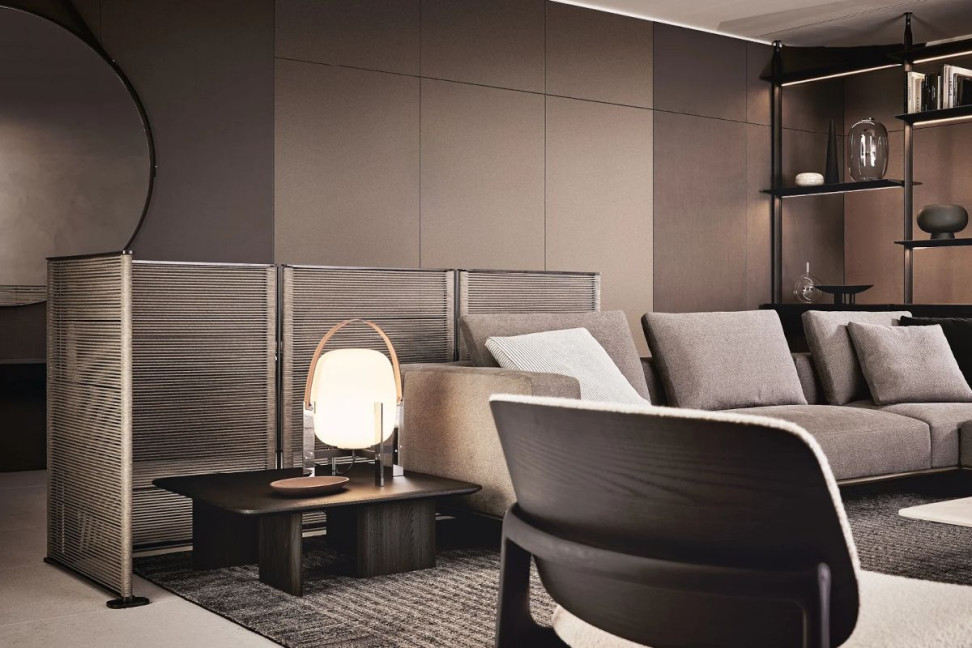 Conçu par Jean-Marie Massaud, le paravent Hima, présenté par Poliform au Salone del Mobile 2022 de Milan, s'harmonise parfaitement avec le nouveau canapé Brera.