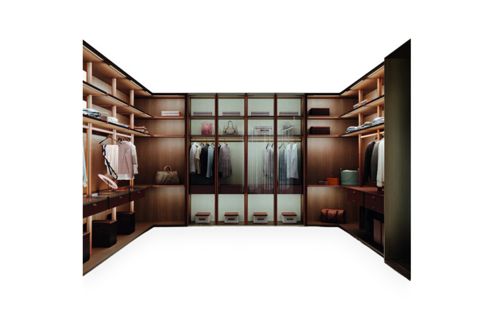 L’armoire de Poltrona Frau peut être personnalisée en choisissant entre des systèmes à épaules ou à montants (y compris freestanding), portes battantes ou coulissantes, espaces ouverts, finitions en cuir, bois, verre ou métal, ainsi qu'une large gamme d'accessoires intérieurs tels que des tiroirs, des étagères, un éclairage intégré et des solutions Beautilities pour l’organisation.