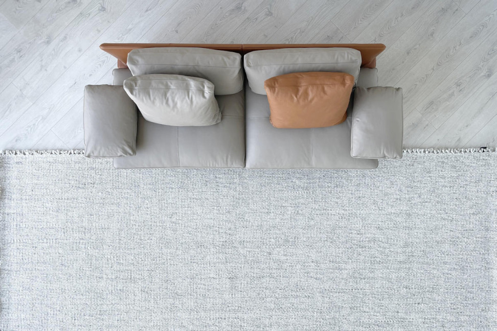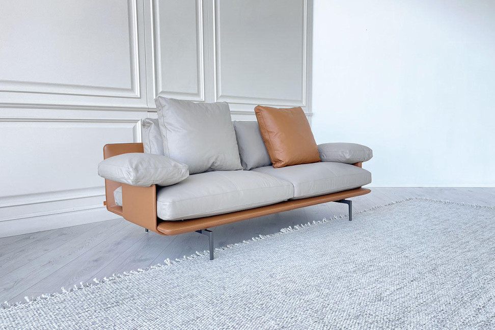 Le canapé Get Back en offre expo dans notre showroom est la version dotée d’un revêtement extérieur en cuir marron, revêtement intérieur en cuir gris et pieds en frêne couleur moka.