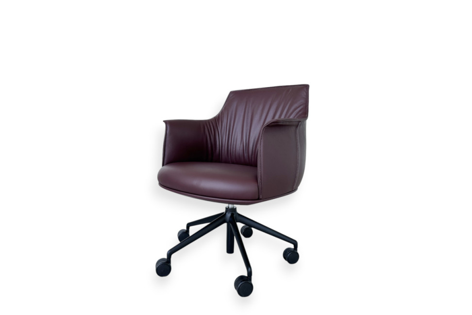 Revêtement en cuir couleur bordeaux. Base à 5 branches en aluminium peint en noir avec des roues adaptées aux sols avec surfaces en fibres textiles.