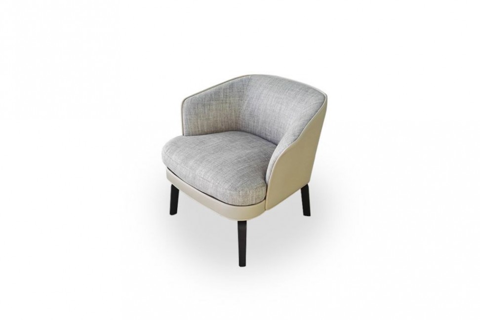 Le fauteuil Nivola, en offre expo dans notre showroom, est caractérisé par un revêtement bicolore réalisé en tissu de couleur gris clair à l’intérieur, et en cuir couleur taupe à l’extérieur. La base est en frêne avec une finition teintée wengé.