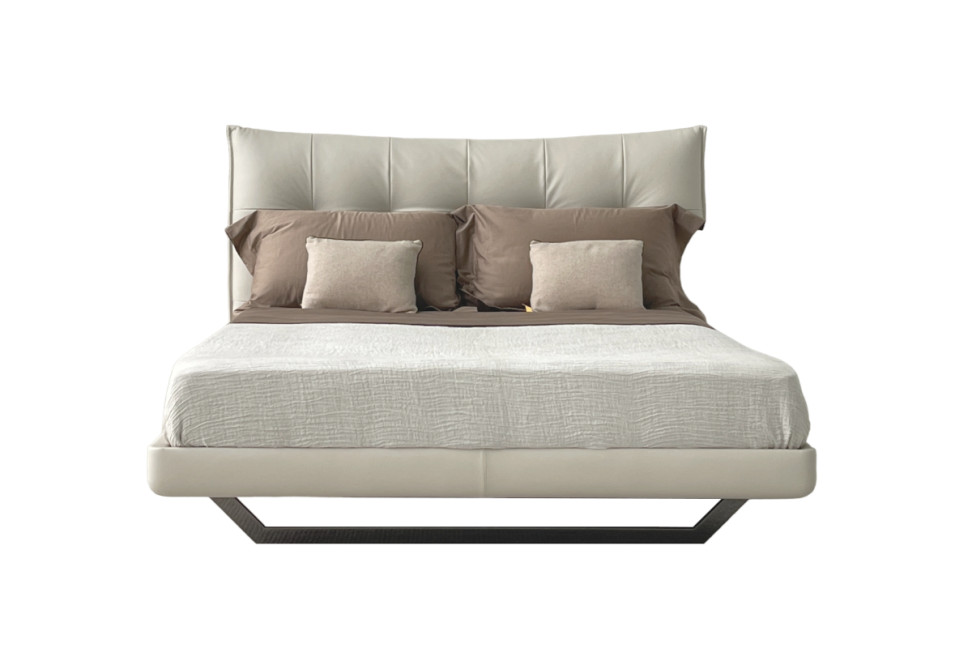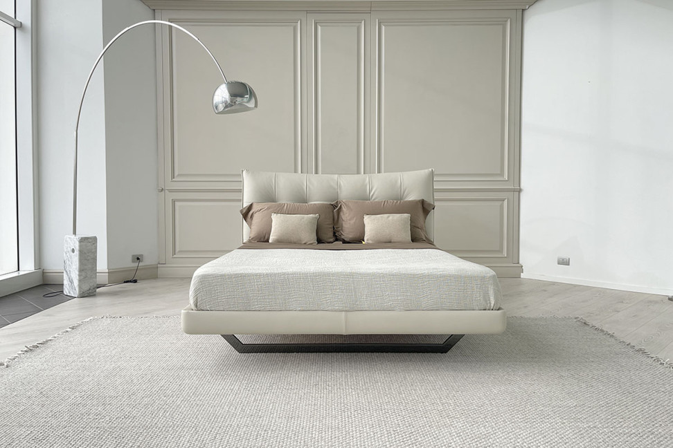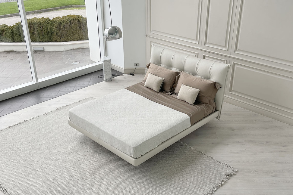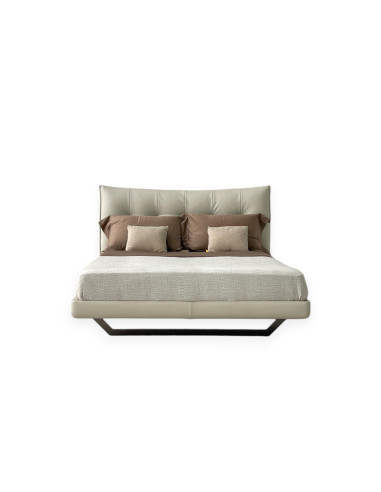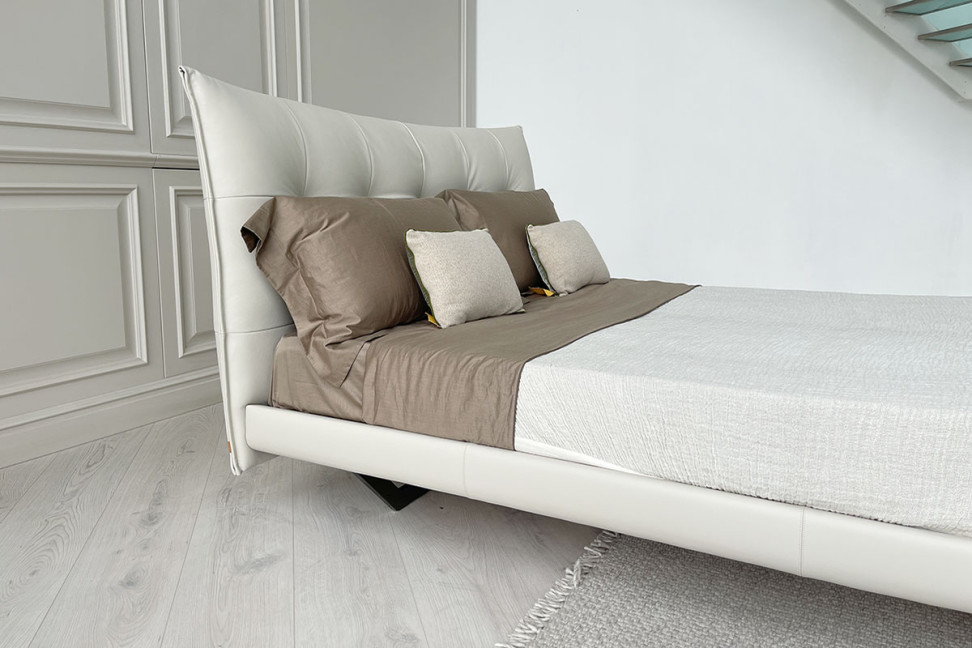 Le lit Aurora Tre proposé dans notre showroom se distingue par son piètement métallique de forme trapézoïdale qui le soulève du sol avec légèreté et résistance. Le cadre et la tête de lit, à l'avant comme à l'arrière, sont recouverts de cuir blanc cassé.