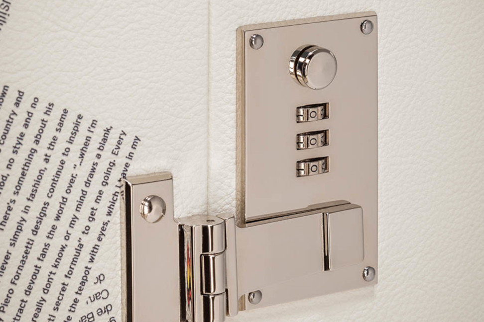 Caractéristiques Techniques: Le cabinet bar Isidoro est fabriqué en contreplaqué de peuplier, avec étagères, tiroirs et portes plaqués en noyer Canaletto, rehaussés de garde-corps en métal chromé. L’intérieur et l’extérieur sont revêtus de cuir Pelle Frau®, décoré du motif “Ultime Notizie” signé Fornasetti, imprimé numériquement pour un effet en léger relief. Il repose sur des pieds fixes et des roulettes pivotantes, avec charnières en acier inoxydable et fermeture à double serrure à combinaison.